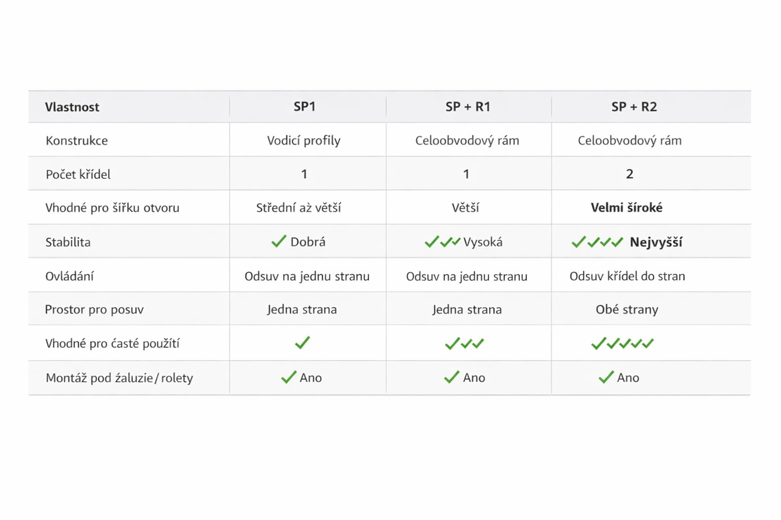 Dvoukřídlé provedení umožňuje rozdělení průchodu na dvě posuvná křídla, která se pohybují ve vodicích profilech. Oproti jednokřídlé variantě je zatížení rozloženo rovnoměrněji, což zajišťuje plynulejší chod, vyšší stabilitu a lepší ovladatelnost u větších šířek. Pro správnou funkci je nutný dostatečný prostor pro boční posuv obou křídel. Systém zároveň umožňuje montáž pod venkovní žaluzii nebo venkovní roletu, takže je ideální volbou i pro objekty s již instalovanou venkovní stínicí technikou, aniž by docházelo ke kolizi jednotlivých prvků nebo omezení jejich funkce.