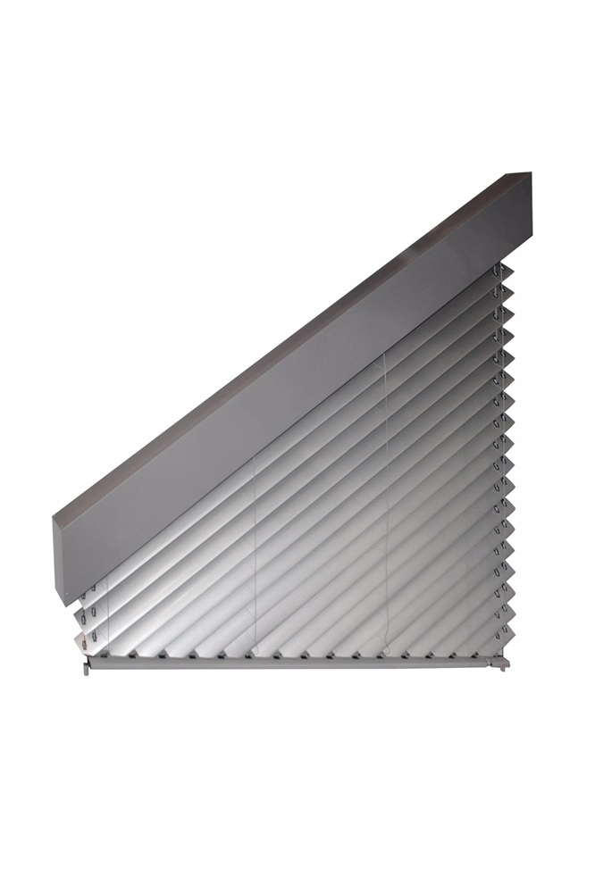 Šikmá žaluzie je ideálním řešením pro zastínění asymetrických tvarů oken, kdy horní rám není horizontální, ale skloněný pod určitým úhlem. Hliníkové lamely kopírují úhel horního rámu a jsou s ním rovnoběžné. Lamely jsou vedeny v ocelovém lanku.